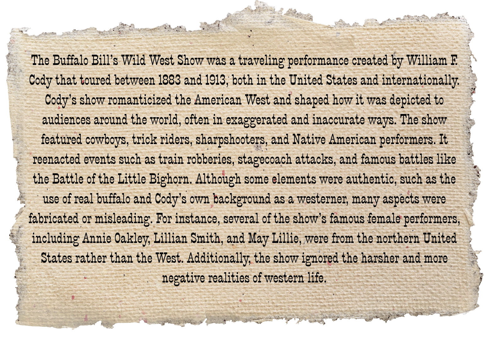 After the American frontier officially closed in the late 1800s, public fascination with the “Wild West” grew. People who lived in cities or in the East had only heard stories of cowboys, Native Americans, outlaws, and frontier life. William F. “Buffalo Bill” Cody, who had worked as a scout, buffalo hunter, and soldier, realized that he could turn his real-life experiences into live entertainment