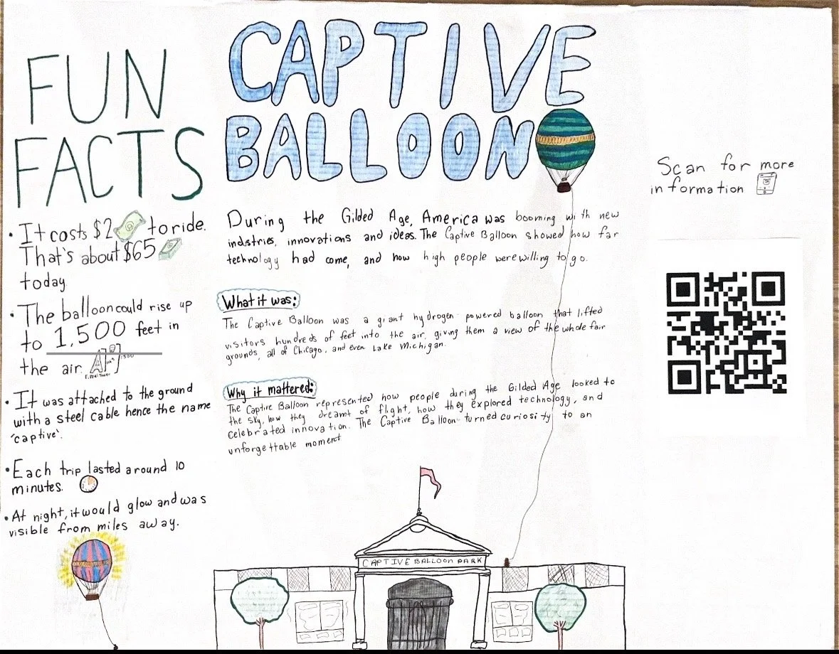 The captive balloon at the 1893 Columbian World’s Exposition was the first of its kind to be displayed, representing the Gilded Age concepts of innovation and progress. Its new and innovative technology allowed visitors to see the fair from above. The display managed to encapsulate the era’s fascination with new technology. It included the use of advanced materials: