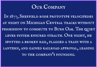 Around since 1877 The Sheffield Velocipede Car Co. About us ~ About us ~ About us ~ Legacy Our Story ~ Our Story ~ Our Story ~